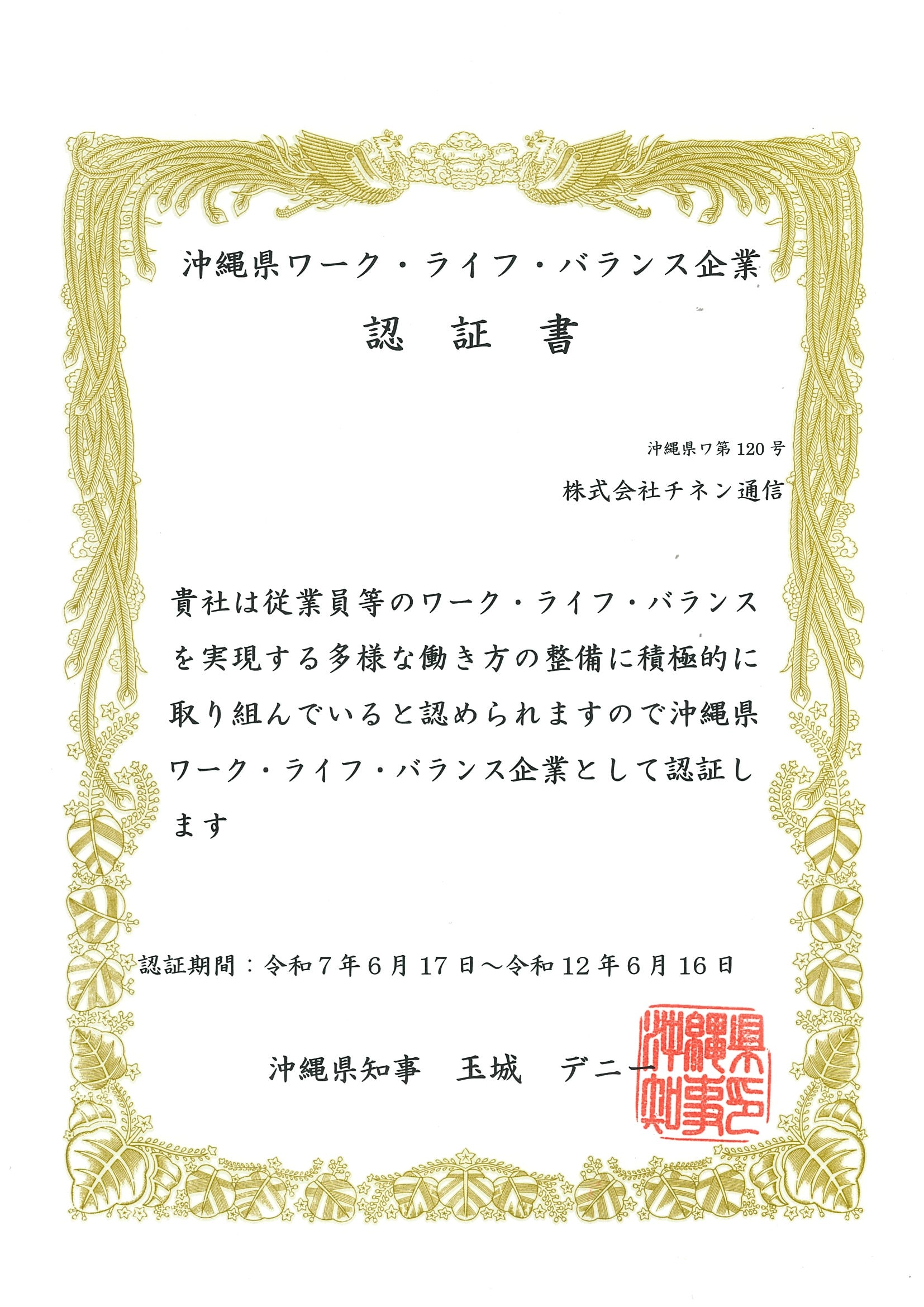 沖縄県ワーク・ライフ・バランス企業に認定